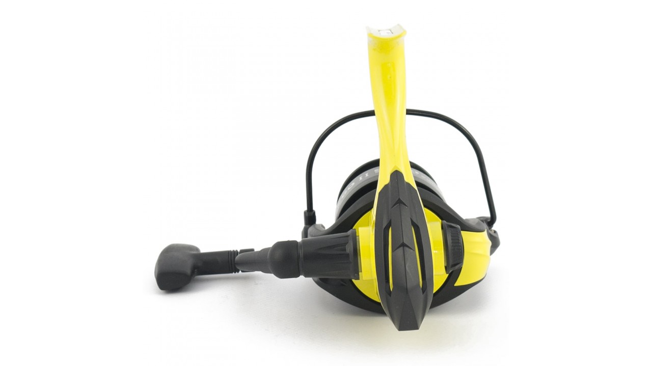 Установлена алюминиевая шпуля с надежным зажимом для крепления лески. Переключатель обратного хода установлен сверху катушки, сзади. Установлен планетарный механизм с шестернями из латуни.