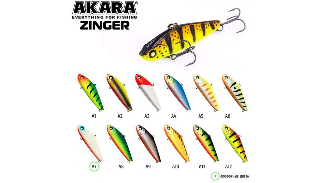 Akara Zinger выпускается в двух размерах 60 и 65 мм, весом 9 и 12 грамм соответственно и окрашивается в яркие цвета, эффективные в зимних условиях. Также в линейке воблер окрашенный фосфоресцирующими красками, который будет полезен для ловли в затемненной воде и в сумерках.
