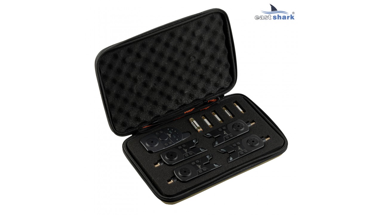 Набор сигнал. с пейджером EastShark SP-15 (4+1) включает в себя удобный кейс, обеспечивающий безопасность и целостность содержимого, 4 электронных сигнализатора поклевки (4 цвета желтый/зеленый/синий/красный), пейджер, элементы питания, инструкция на английском языке и запасные колечки O-ring для сигнализаторов, шнурок. Покрытие сигнализаторов и пейджера Soft touch — это эластичное резиноподобное матовое лакокрасочное покрытие, обладает хорошей адгезией с металлами, деревом, тканями и большинством полимерных материалов, повышенной износостойкостью, гигиенично и выдерживает длительные истирающие нагрузки.