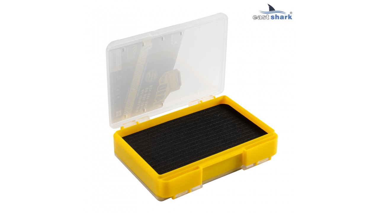 Внутри коробочки, с каждой стороны, симметрично расположен пористый вкладыш с прорезями для фиксации крючков приманок.